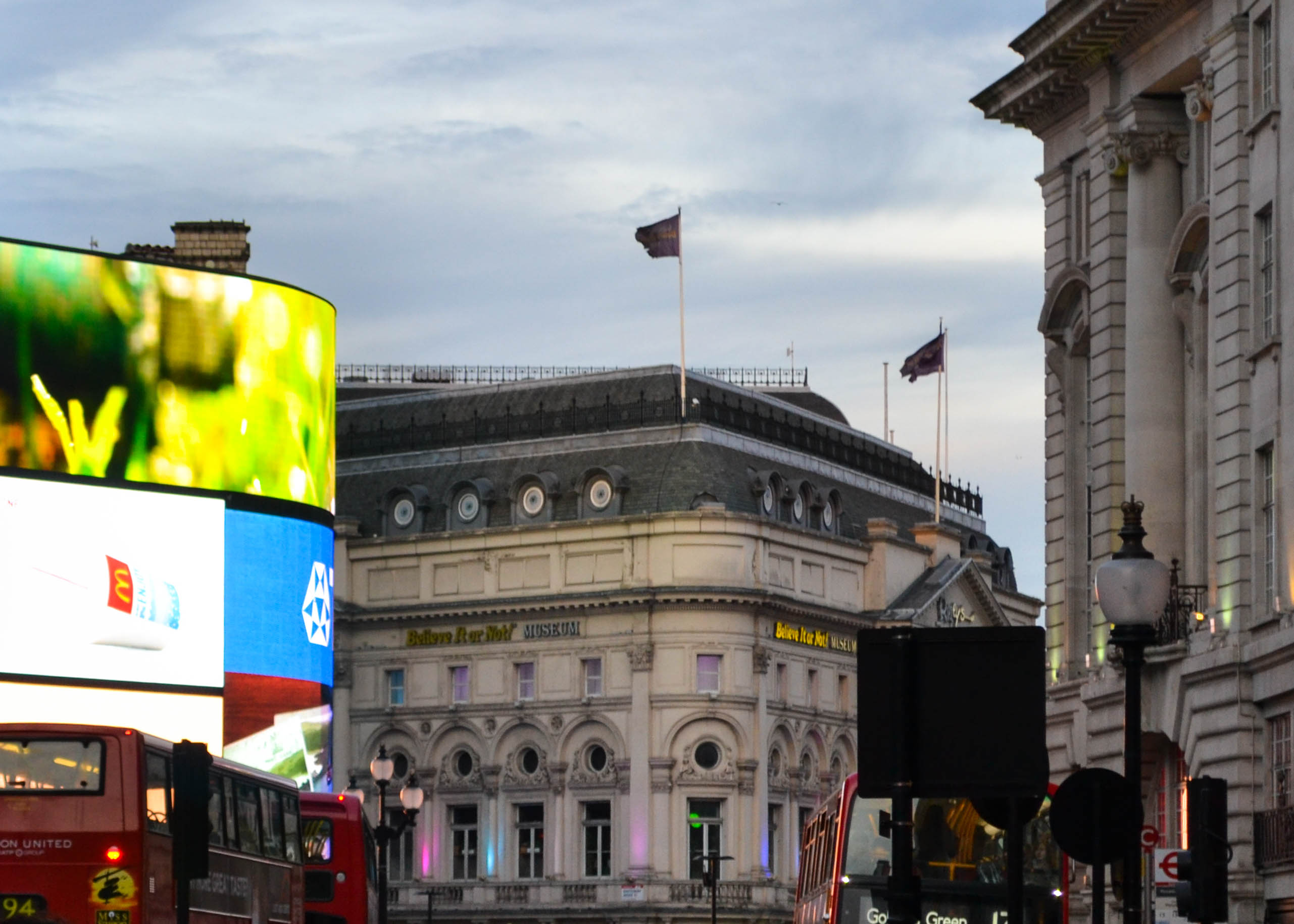 <<Picadilly Circus is zeer mooi om ‘s avonds naartoe te gaan. Op het plein waan je je dan in een klein New York, door de grote lichtreclames op de gevels van de gebouwen rondom. In de buurt van Picadilly vind je een groot aantal theaters, waar je de keuze hebt tussen de vele musicals die daar gespeeld worden.>> (kalender en kaarten voorstellingen)