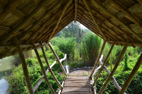 In het centrum van de tuin is er een water zuivering gemaakt met daar midden in een eiland (techno island). Hierop zijn enkele hutjes en hebben wij geholpen met het maken van een dok voor ons zelfgemaakt vlot.
