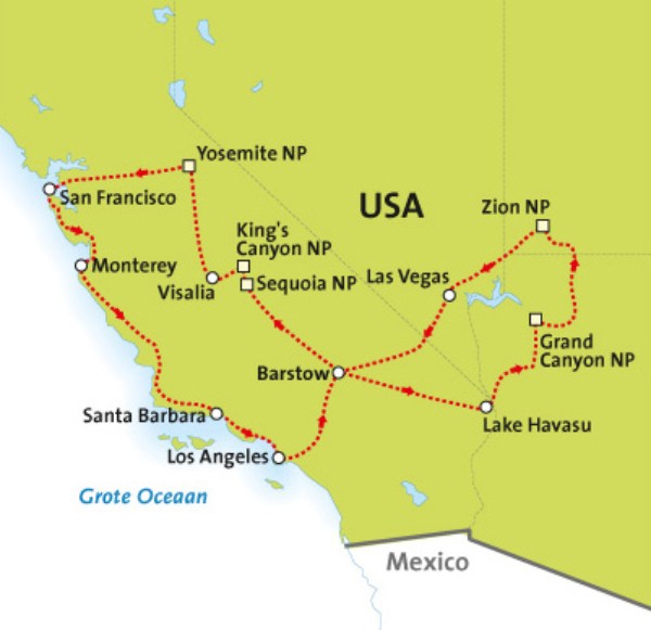Dag 1 Amsterdam – San Francisco Vliegreis naar San Francisco. Na aankomst in San Francisco gaat u naar uw hotel. In San Francisco verblijft u na de vliegreis een nacht in een hotel. Zo bent u goed uitgerust als u de volgende dag uw camper ophaalt. Dag 2 San Francisco – Monterey (147 km) Vandaag haalt u de camper op en krijgt uitleg over het gebruik van de camper, alvorens het eerste deel van uw route af te leggen: van San Francisco naar Monterey. U verblijft hier een nacht. De omgeving van Monterey is bijzonder mooi. Het natuurlijk leven is hier weelderig: zeeleeuwen, zeehonden, otters, zeeolifanten en zelfs enkele honderden grijzen walvissen die langs de kust zwemmen, soms dicht bij de haven. Bezoek Fisherman's Wharf en Cannery Row of rij naar het nabijgelegen plaatsje Carmel of maak een rit over de fameuze 17-Mile Drive. Dag 3 Monterey – Santa Barbara (357 km) U reist verder over een van de mooiste wegen van de USA: Highway US1. Langs deze kustweg zijn talloze stops zodat u kunt genieten van het uitzicht en voldoende foto's kunt nemen. Onderweg kunt u stoppen in Los Lobos waar u kans heeft om zeeotters waar te nemen. U komt aan in Pfeiffer Big Sur State Park, een mooi park met Redwood bomen waar u de camper even kunt parkeren en de omgeving te voet kunt gaan ontdekken. Neem uw tijd en geniet. Maak de korte wandeling naar de McWay watervallen en spot zeeotters langs de Partington Cove Trail. Een stukje zuidelijker langs Highway US1 raden wij u aan te picknicken bij Morrow Rock in het Morrow State Park. Wederom een goede kans om zeeotters en zeehonden te spotten terwijl u geniet van het buitenleven. De mooie route leidt u vervolgens richting Santa Barbara, waar u overnacht. De stad is opgebouwd nabij een missiepost die op 4 december 1786 door Spaanse Franciscanen was opgericht en is genoemd naar de heilige Barbara. Op 29 juni 1925 werd de stad zwaar beschadigd door een aardbeving en vervolgens grotendeels herbouwd. Tegenwoordig is Santa Barbara een welvarende stad die populair is als toeristische bestemming en als woonplaats voor beroemdheden. Dag 4-5 Santa Barbara – Los Angeles (210 km) Via Malibu, bekend van de televisieserie Baywatch, reist u met uw camper in zuidelijke richting naar Los Angeles. U verblijft hier twee nachten zodat u een keuze kunt maken uit de vele bezienswaardigheden en activiteiten die deze metropool rijk is. Een bezoek aan de stranden van Santa Monica, het flitsende Hollywood, of Disneyland in Anaheim behoort tot de mogelijkheden. Bewonder ook het prachtige uitzicht over de stad en de Hollywood Hills vanuit Griffith Park. Dag 6 Los Angeles – Calico Ghost Town (253 km) U laat de drukte van de 'the City of Angels' achter u en rijdt de natuur in richting de woestijn en Calico. Calico is een spookstad in de regio van de Mojavewoestijn in het zuiden van Californië. Eens woonden er 1200 mensen in Calico en werden er meer dan 500 mijnen uitgebaat. Toen de prijs van zilver instortte, in het midden van de jaren 1890, loonde het niet langer om de zilvermijnen uit te baten. Toen ook het winnen van borax in 1907 werd stopgezet werd de stad helemaal verlaten. De stad is dagelijks open; na het kopen van een kaartje biedt de stad naast winkelen en eten in het restaurant onder meer de mogelijkheid om mijnen te bezoeken, revolvergevechten te zien en goud te wassen en een spoorweg. Tijdens de rondleidingen in de mijnen worden nog steeds grijze vlekken van zilver in het gesteente gezien. Sommigen menen dat Calico ook echte spoken huist, dat de geesten van mijnwerkers er nog aanwezig zijn. Dag 7 Calico Ghost Town – Lake Havasu (298 km) Via het Mojave National Preserve rijdt u met uw camper naar Lake Havasu. Naast flora en fauna staat Mojave National Preserve ook bekend om zijn vulkanische landschap en zijn zandduinen. Lake Havasu City is een middelgrote stad in het noordwesten van de staat Arizona waar het Havasu stuwmeer de grens met de staat Californië vormt. Lake Havasu City ligt in de Mohave County aan het Bridgewater kanaal. Over dit kanaal ligt de originele London Bridge die door een plaatselijke ondernemer is gekocht van de stad Londen. De brug is één van de populairste toeristische trekpleisters van de staat Arizona. Lake Havasu City is een jonge stad die pas in de jaren 60 van de vorige eeuw is ontstaan. Het Havasu stuwmeer is ontstaan door de aanleg van de Parkerdam. Lake Havasu heeft prachtige zandstranden met schoon, helder en fris water die ideaal zijn om in te zwemmen. Doordat u per camper reist kunt u hier optimaal genieten van het buitenleven en gaan zwemmen of picknicken. Het water heeft weinig tot geen golven, en vrijwel geen stekende insecten. Het is perfect om af te koelen in de zomer wanneer de temperatuur stijgt. Dag 8-9 Lake Havasu – Grand Canyon (499 km) Vandaag staat een bijzondere bestemming op het programma, de wereldberoemde Grand Canyon. Voordat het zover is bezoekt u eerst Kingman en kunt u met uw camper een stuk rijden over de oorspronkelijke Route 66. Later op de dag bereikt u daadwerkelijk de Grand Canyon, waar u twee nachten kampeert. In de loop van miljoenen jaren heeft het water van de Colorado deze kloof in het landschap doen ontstaan. De wanden van de Grand Canyon zijn roodachtig gestreept. Het rode gesteente van de Grand Canyon is op zijn mooist vlak na zonsopkomst en even voor zonsondergang. Het verdient dan ook aanbeveling om rond deze tijden de Canyon te bezoeken. U heeft een volle dag om van het natuurschoon te genieten. Maak een wandeling langs de vele uitzichtspunten van de Rim Trail. Dag 10-11 Grand Canyon – Zion National Park (408 km) Voordat u in Zion aankomt rijdt u eerst naar Lake Powell, gevormd door de Glenn Canyon dam. In het Zion, een National Park sinds 1919, bestaat uit bijna 600 km2 rotsen en ravijnen. De naam komt van de Mormonen, de eerste blanken die het park ontdekten; 'Zion' refereert aan een veilige plaats. In Zion zijn ruim 800 plantensoorten te vinden evenals 380 verschillende diersoorten (waaronder 