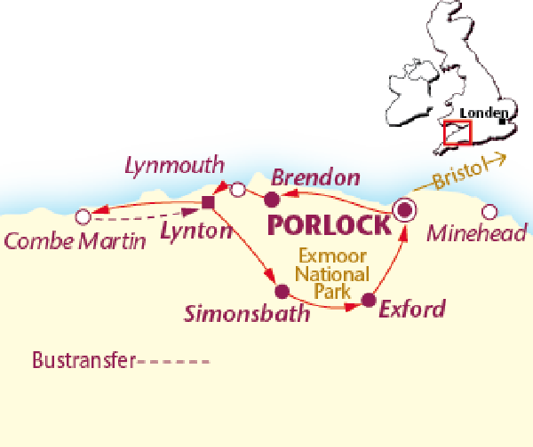 Het Exmoor National Park ligt in de graafschappen Sommerset en Devon, in het zuidwesten van Groot-Brittannië. Aan de noordkant wordt het begrensd door hoge, steile klifkusten en mooi gelegen plaatsen als Porlock en Lynmouth. In het binnenland treft u golvend heuvelland en moerassige veengronden aan, begroeid met heide, gras en varens. De talrijke dalen en valleien zijn fraai bebost, met oude voetbruggen over snelle stroompjes. De vele wandelpaden door dit park, langs klifkusten, cottages en door lieflijke dorpjes maken het een bijzondere tocht.