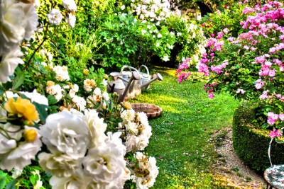 Een hectare aan velden en tuin omgeven het huis en de bloementuin is een lust voor het oog met een weelde aan kleuren. De tuin is “ouderwets” ingericht en is zo bijzonder dat deze wordt vermeld in een uitgegeven boek