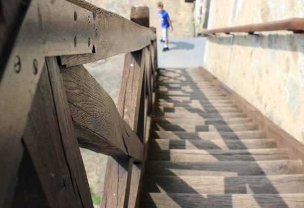 <<Kasteel/ Ruïne Larochette. Een vakantiefoto betekent niet altijd een plaatje van een strand bij een azuurblauwe zee. Door de mooie lichtval wordt zelfs een trap 'bijzonder' en fotowaardig. Beneden staat mijn broertje die opkijkt tegen de steile kasteeltrap.>>