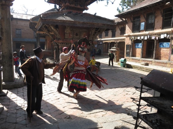 <<Deze tempel is een van de meest unieke van Nepal en staat na de aardbeving op instorten. Hoewel veel cultureel erfgoed gereduceerd is tot een hoop puin, is Nepal echter nog altijd een prachtige reisbestemming. Het land staat immers bekend om de mooiste wandelroutes ter wereld en dat kan ik bevestigen. Ook staat er nog ongelooflijk veel moois overeind, waaronder dus deze tempel. Het schouwspel op de foto is van een man met masker (van achteren gefotografeerd), die vooral kinderen maar ook volwassen mannen de stuipen op het lijf jaagt. Zij lokken deze representatie van een boze geest uit, en rennen vervolgens voor hem weg. Tientallen mensen rennen heen en weer over het plein. En opa (op de voorgrond) is ook nog altijd van de partij.>>