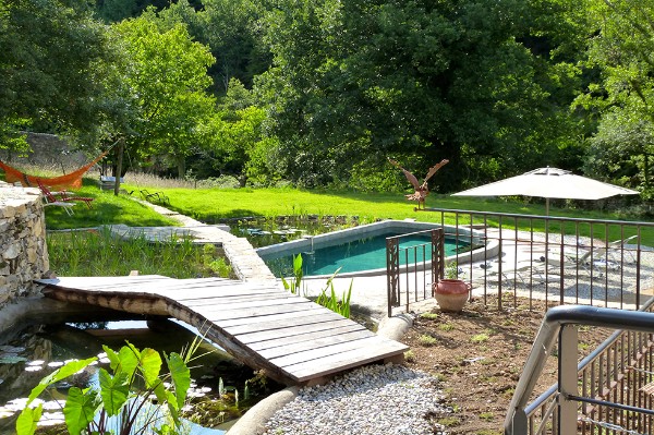 Hier geniet u van een bijzondere tuin en zwembad. Het natuurlijke zwembad functioneert volgens hetzelfde principe als dat van natuurlijke meren. Het water wordt gereinigd door de aanwezige rietplanten via een natuurlijk systeem van filtering. Op deze manier is het water helder en schoon en u geniet van de natuurpracht om u heen. Heerlijk zwemmen zonder chemicaliën.