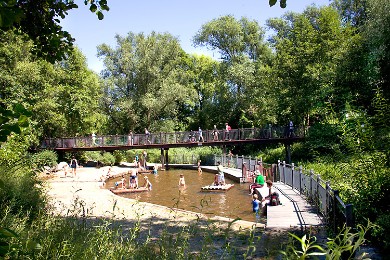 * Schlossinsel (5,8 hectare) met Water- speeltuin (eldorado gezinnen; kinderen die poedelen in het water, baggeren in zand of het water rondpompen), klimpyramide, labyrint en de Klanggarten (tuin met muziekinstrumenten om te bespelen)