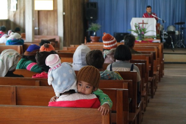 <<Huai Hom Karen dorp in Mae Sariang (Mae Hong Son District). Hier kwamen we op zondag de kerk binnen gelopen in één van de vele kleine bergdorpjes in het noorden van Thailand. De kinderen vonden het zeer interessant om te zien, die toeristen. De volwassenen waren aan het zingen en zeer aandachtig aan het luisteren.De bewoners leven met minimale voorzieningen, maar zijn toch gelukkig en één grote familie. Altijd even vriendelijk voor elkaar en voor anderen. Het wordt niet voor niks het Land van de Glimlach genoemd. In dit dorp maken de vrouwen sjaals, mutsen en kleren met wol van hun eigen schapen. Zelf droegen de vrouwen en kinderen een hoop kleren. Zeer opmerkelijk aangezien het 30 graden was.>>