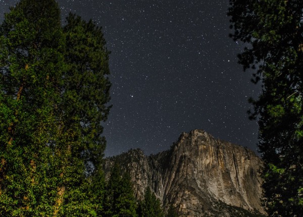 <<Sterrenhemel in een speciaal landschap. Een vuistregel bij het fotograferen van sterren is dat er geen maan aanwezig moet zijn om zo veel mogelijk sterren te 'vangen'. Bij deze foto heb ik de maan echter in mijn voordeel kunnen gebruiken om de berg en de bomen volledig op te lichten en toch nog genoeg sterren weten te vangen.>>